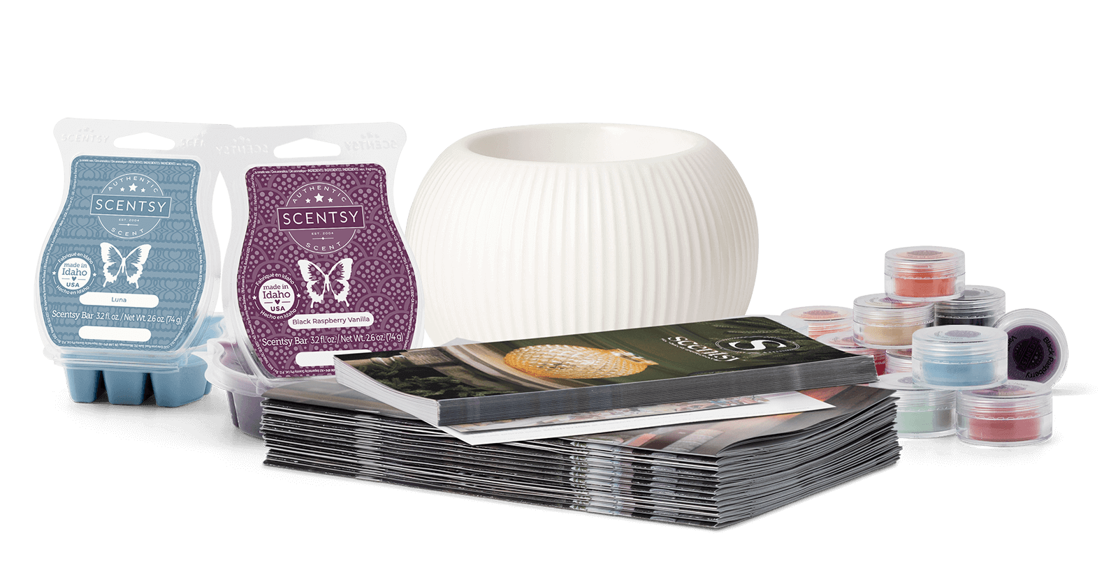 The Starter Kit includes everything you need to start your Scentsy business: a best-selling Warmer, more than 80 scented wax testers, catalogs, order forms, three months of your own PWS, product samples and more. (Contents may vary.)