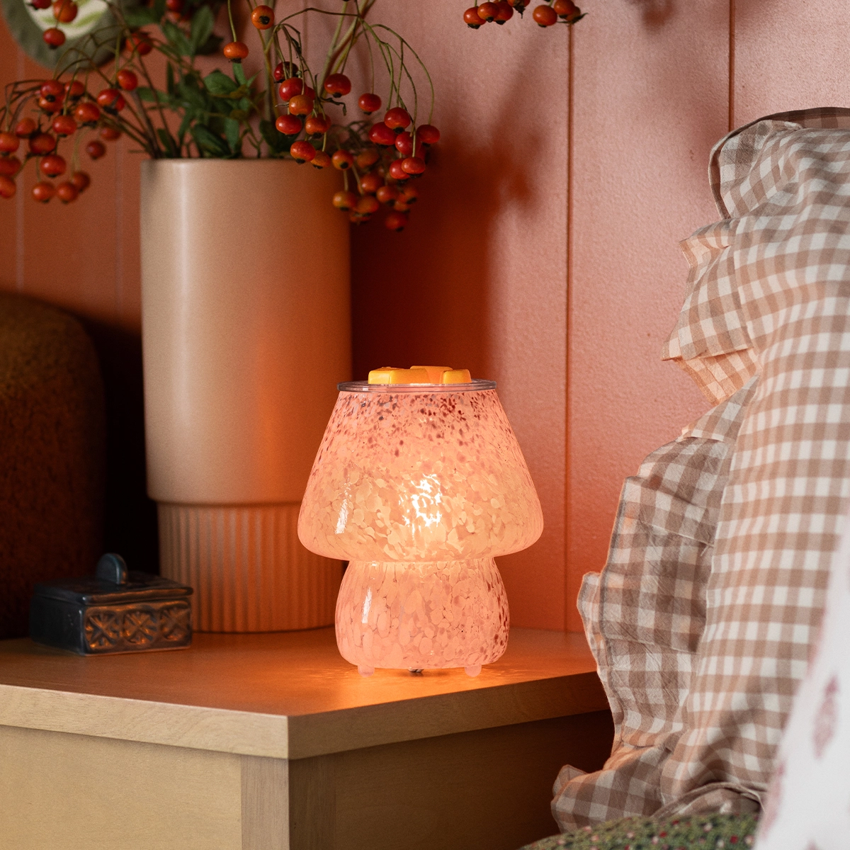 Radiant art glass inspired by contemporary lamp designs creates a stunning silhouette that feels vintage and modern at the same time. Its confetti-flecked surface is speckled with luminous fragments of white and taupe colorways to give each Warmer its own unique pattern. When lit, a warm, dappled glow shines in all directions.