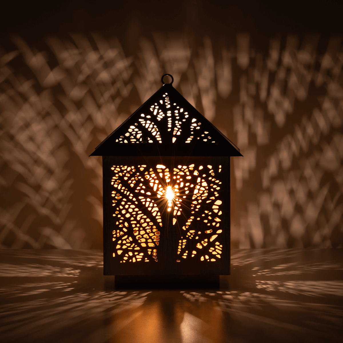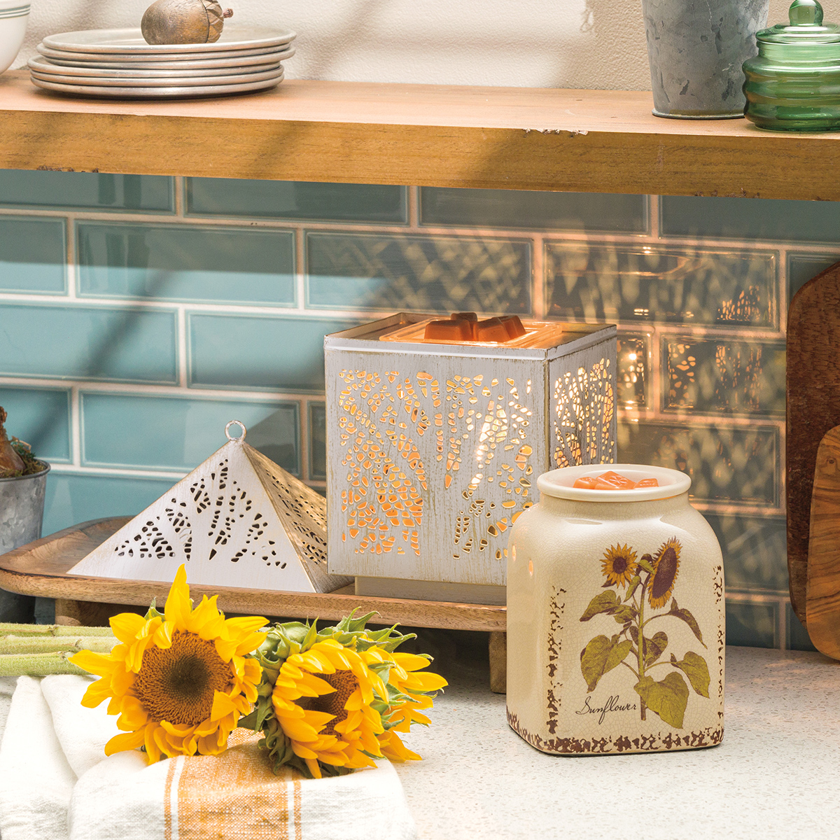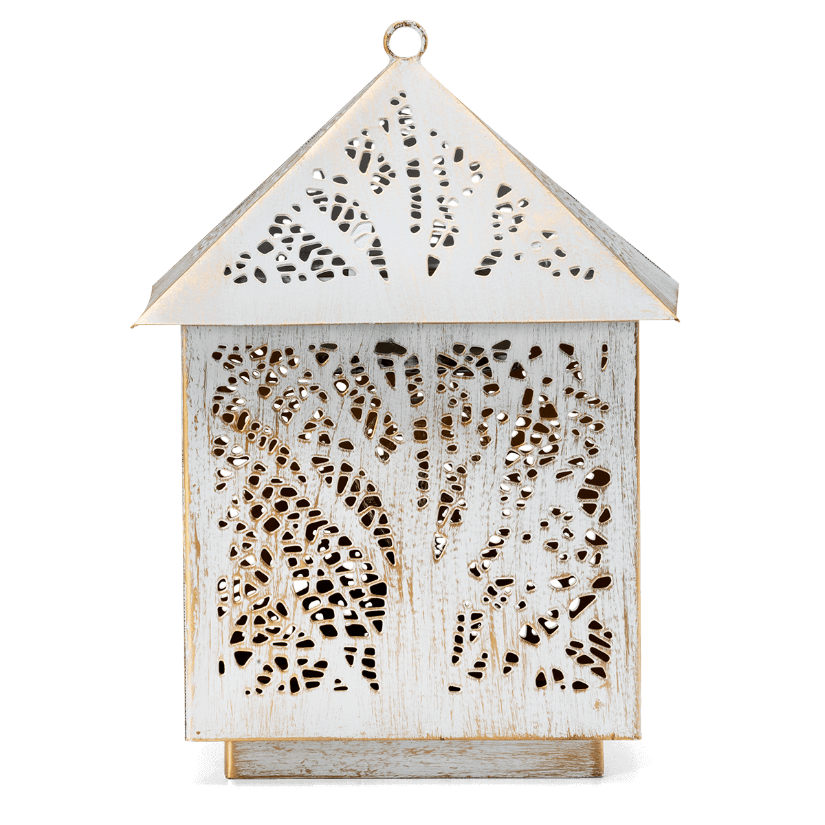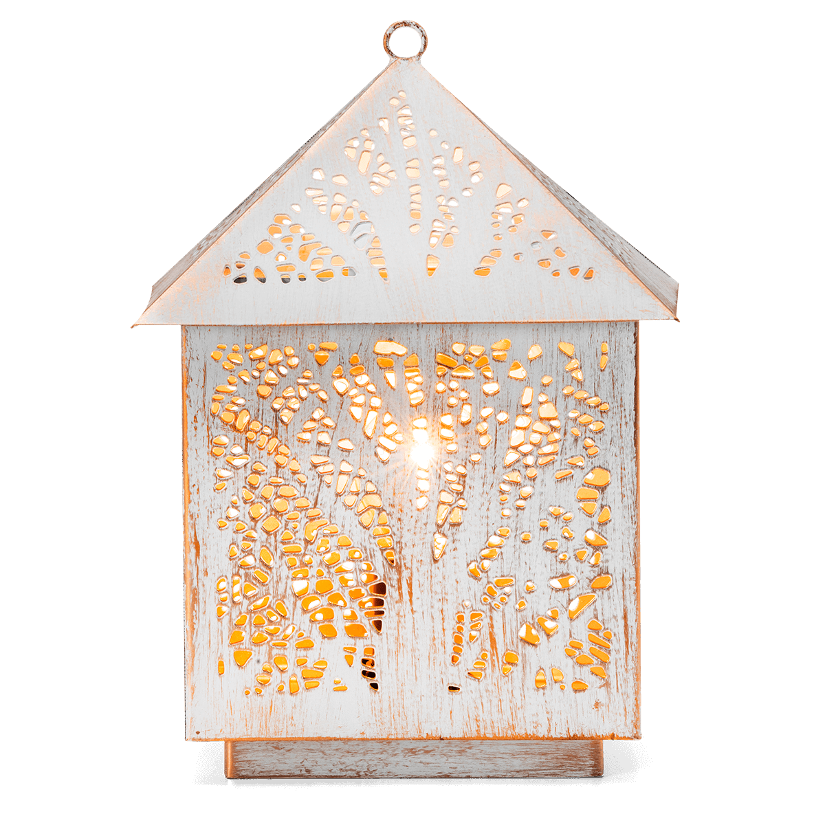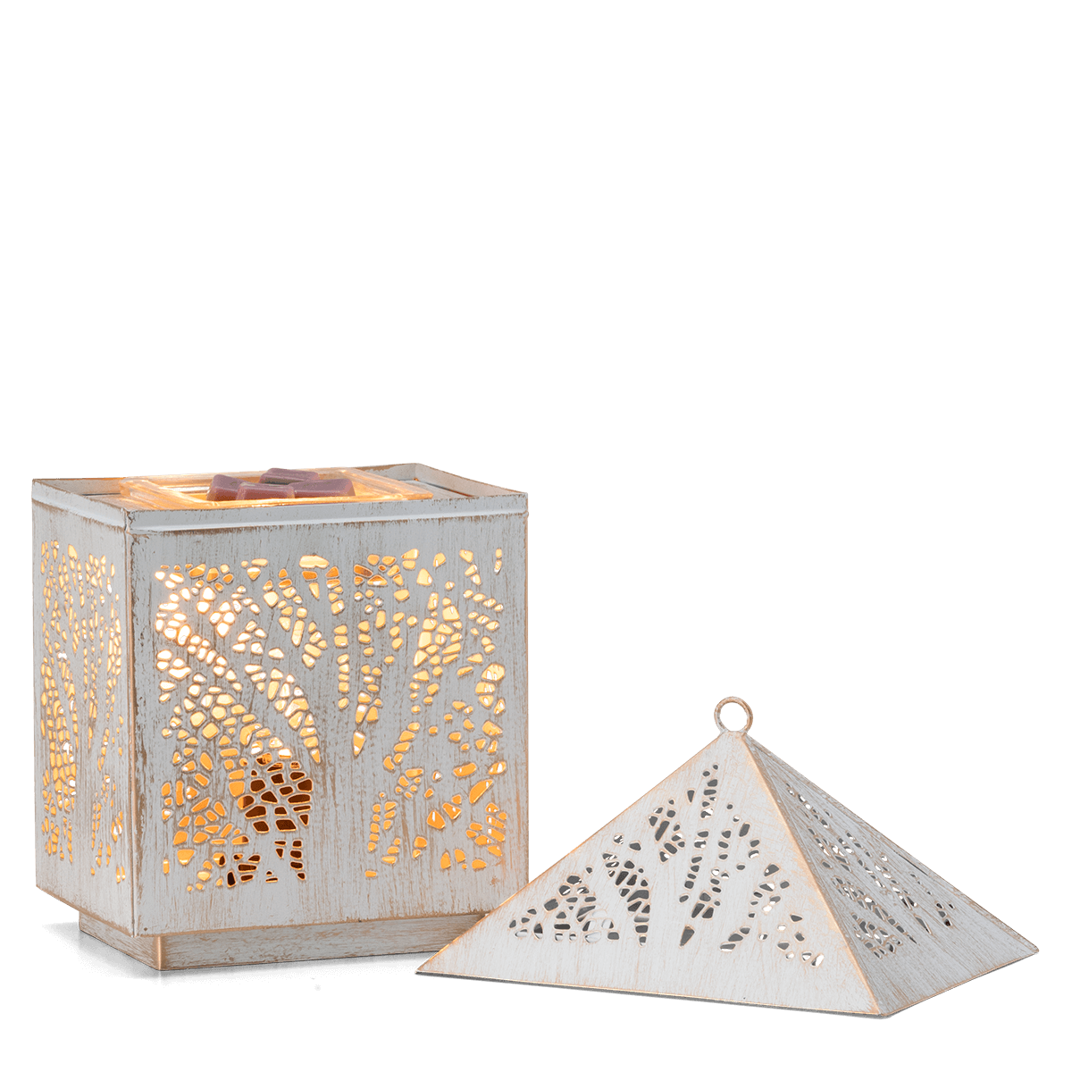 Like sunlight shining through the trees, dappled light pours out from every facet of this whitewashed, etched metal warmer. The brilliant display shines on nearby surfaces when lit.