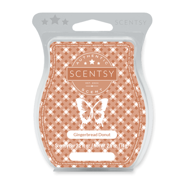 Gingerbread Donut Scentsy Bar: GINGERBREAD, SPICED DONUT and VANILLA BEAN. 3.2 fl. oz/Net Wt. 2.6 oz / 8 cubes per bar.