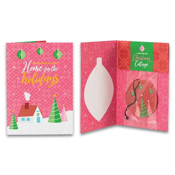 Christmas Cottage Holiday Greeting Cards: A scent circle and holiday card all in one! Each Scent Circle features a unique design. There are a Pack of 5 cards all with the Christmas Cottage scent circle. Christmas Cottage is a blend of ORANGES, RASPBERRIES, CLOVE and SPICES.