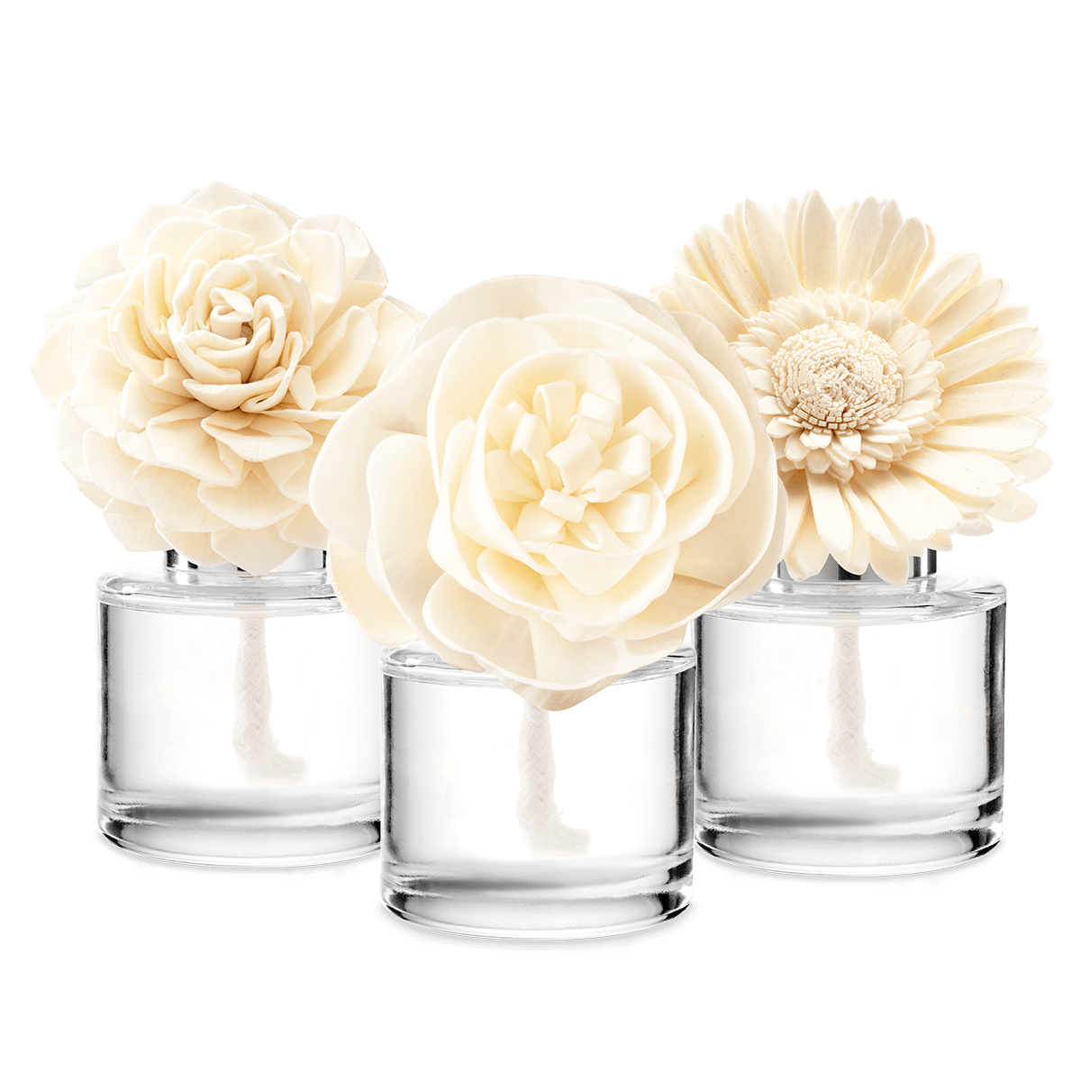 Scentsy Fragrance Flowers releases beautiful scent while looking lovely in any space. Just set it out and enjoy—no plug, no problem. Each flower is handcrafted of natural sola wood material, so no two are exactly alike! The Flowers absorb and hold fragrance oil for gorgeous scent that lasts up to 60 days. It’s compact size is perfect for nightstands, deks, vanities and other small spaces. The Fragrance Flower comes with everything you need – the flower, a glass jar filled with fragrance oil and a silver decorative cap. 4.5″ tall.