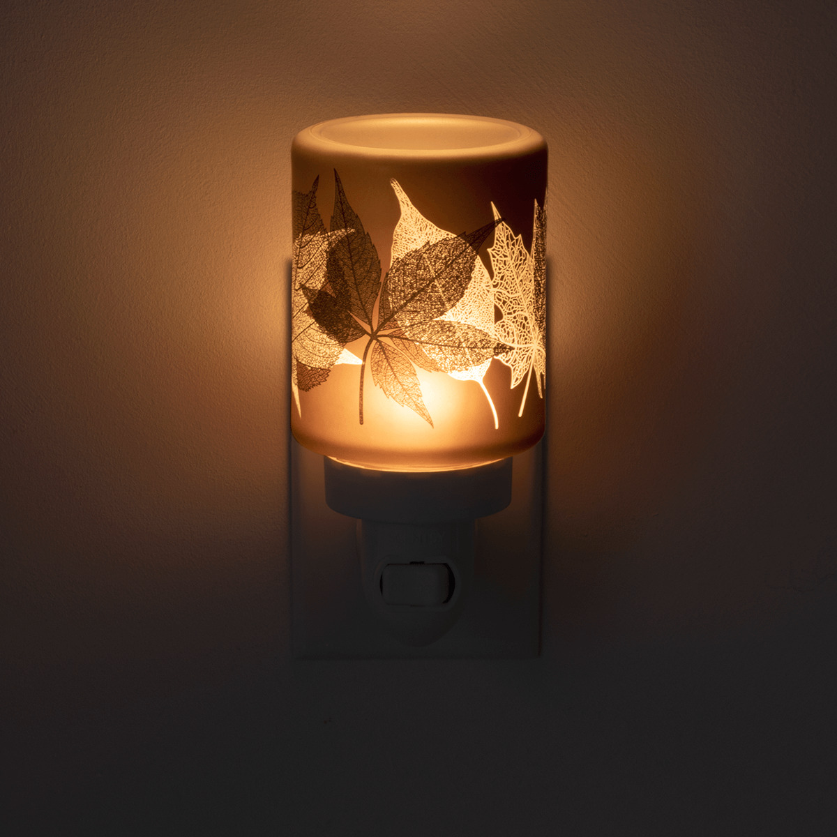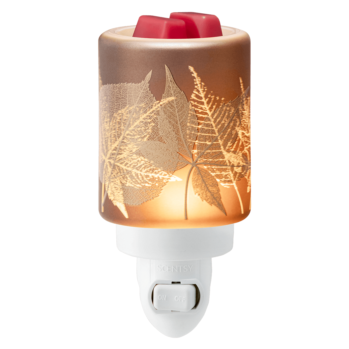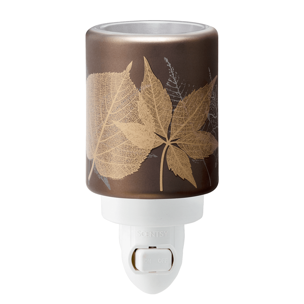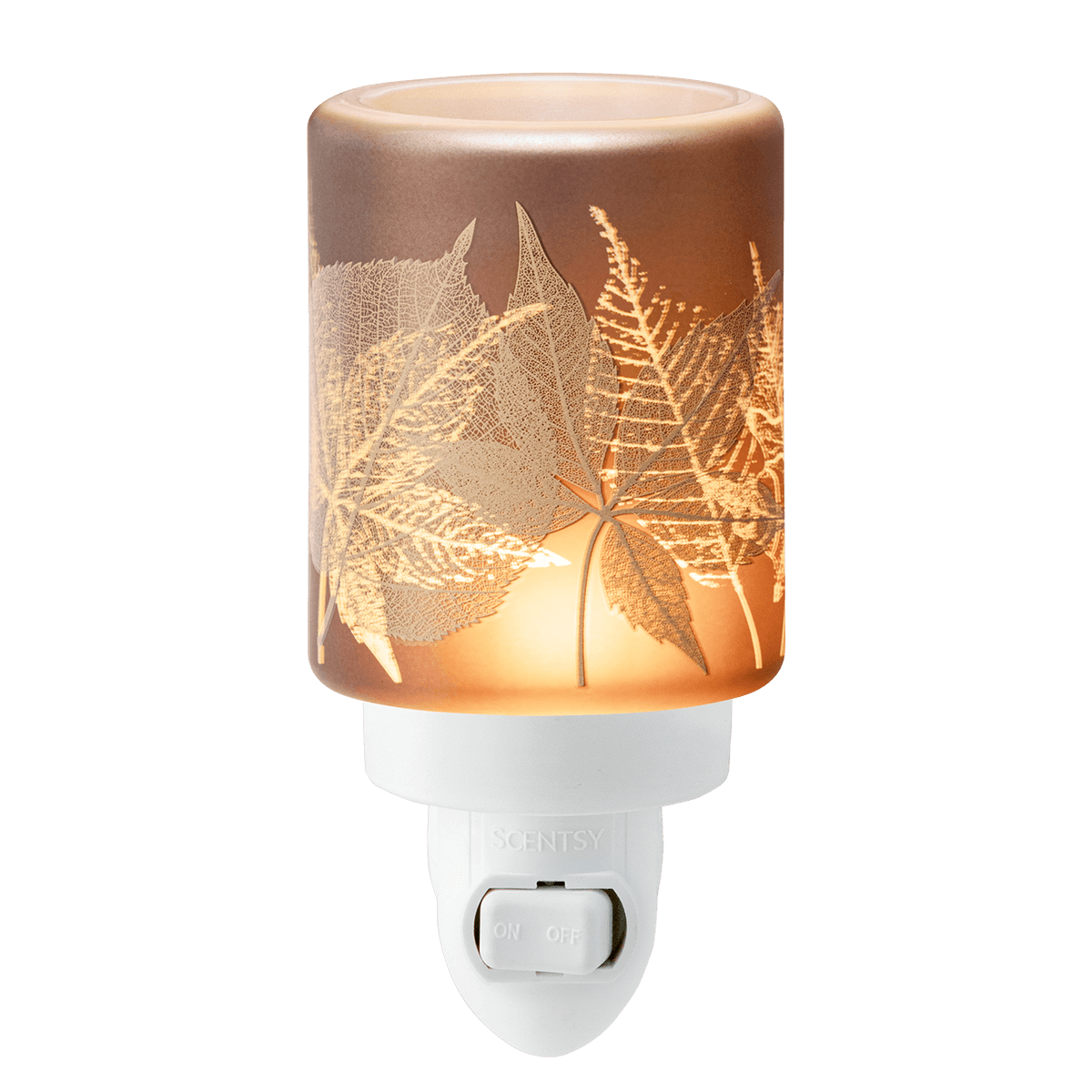 Glow up your autumn evenings with this radiant mini warmer, featuring finely detailed golden leaves against a warm, bronze-toned background.
