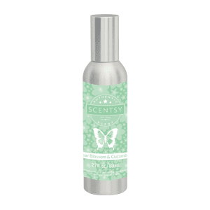 Scentsy Room Spray – Pear Blossom & Cucumber – 2.7 fl. oz / 80 ml – use to quickly freshen up a room. Delicate pear blossom, rain-kissed jasmine, honeydew and Meyer lemon smoothed by a splash of cucumber water.