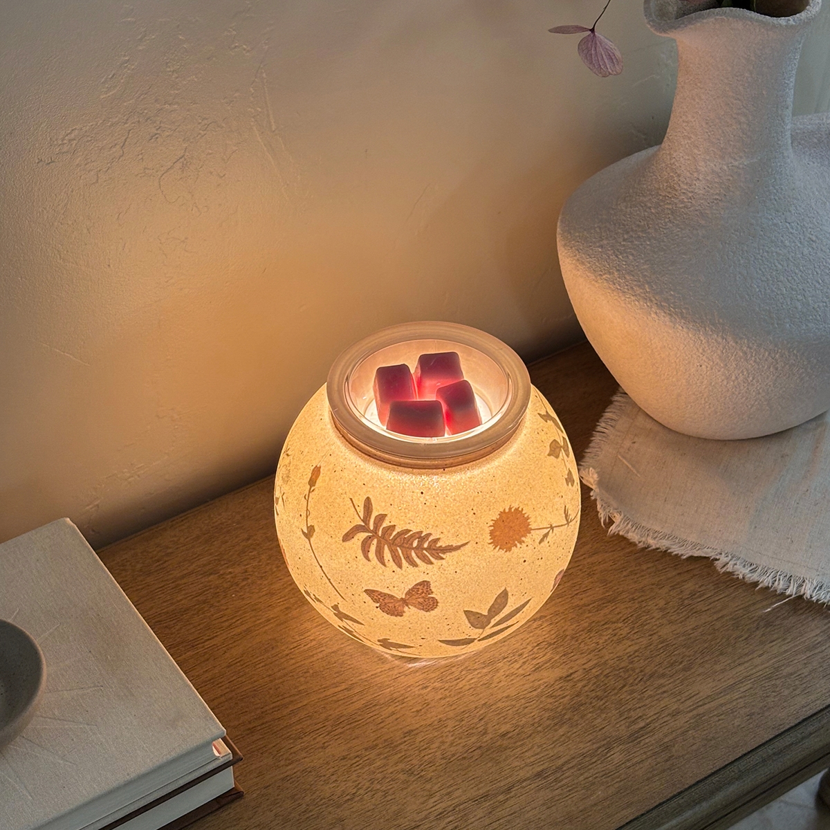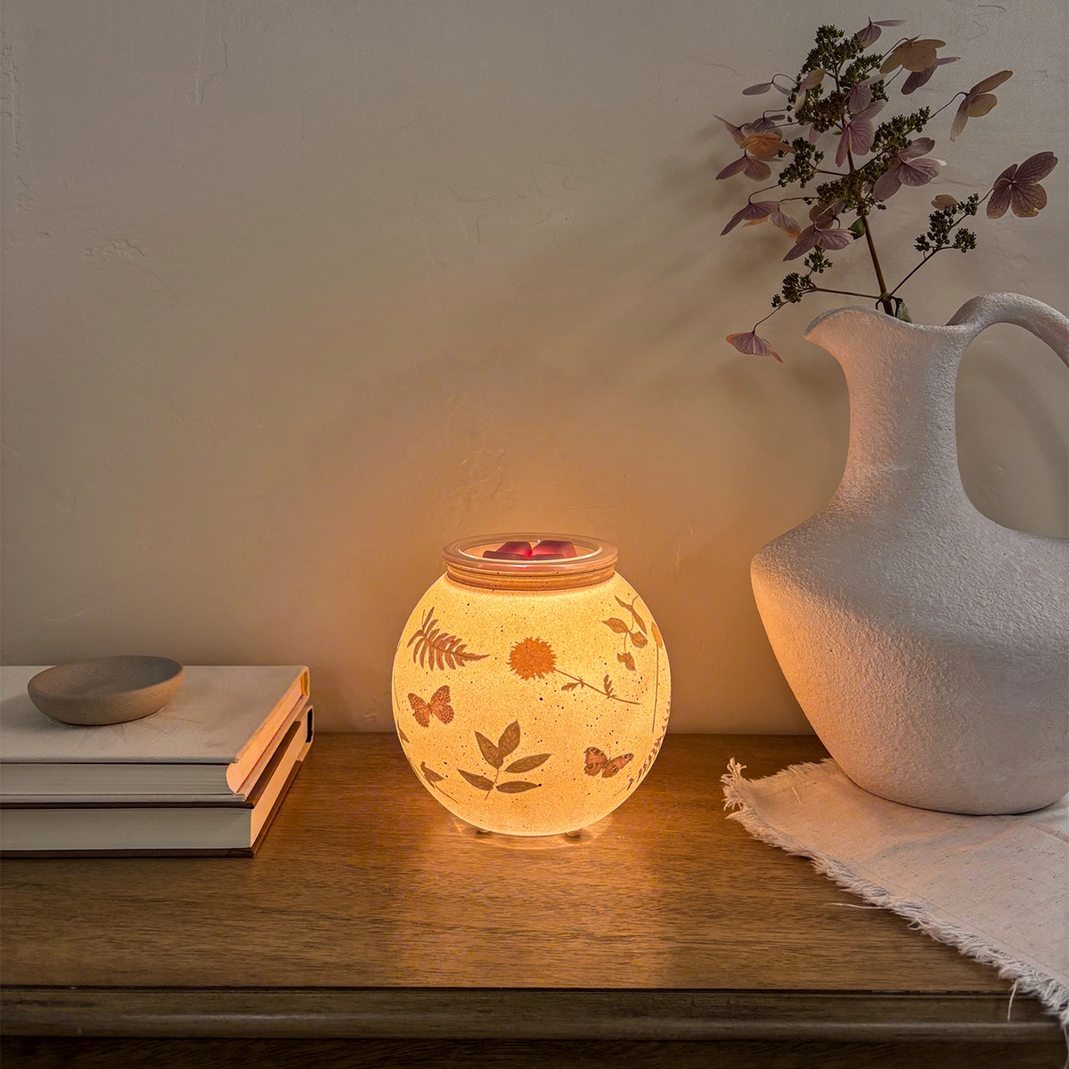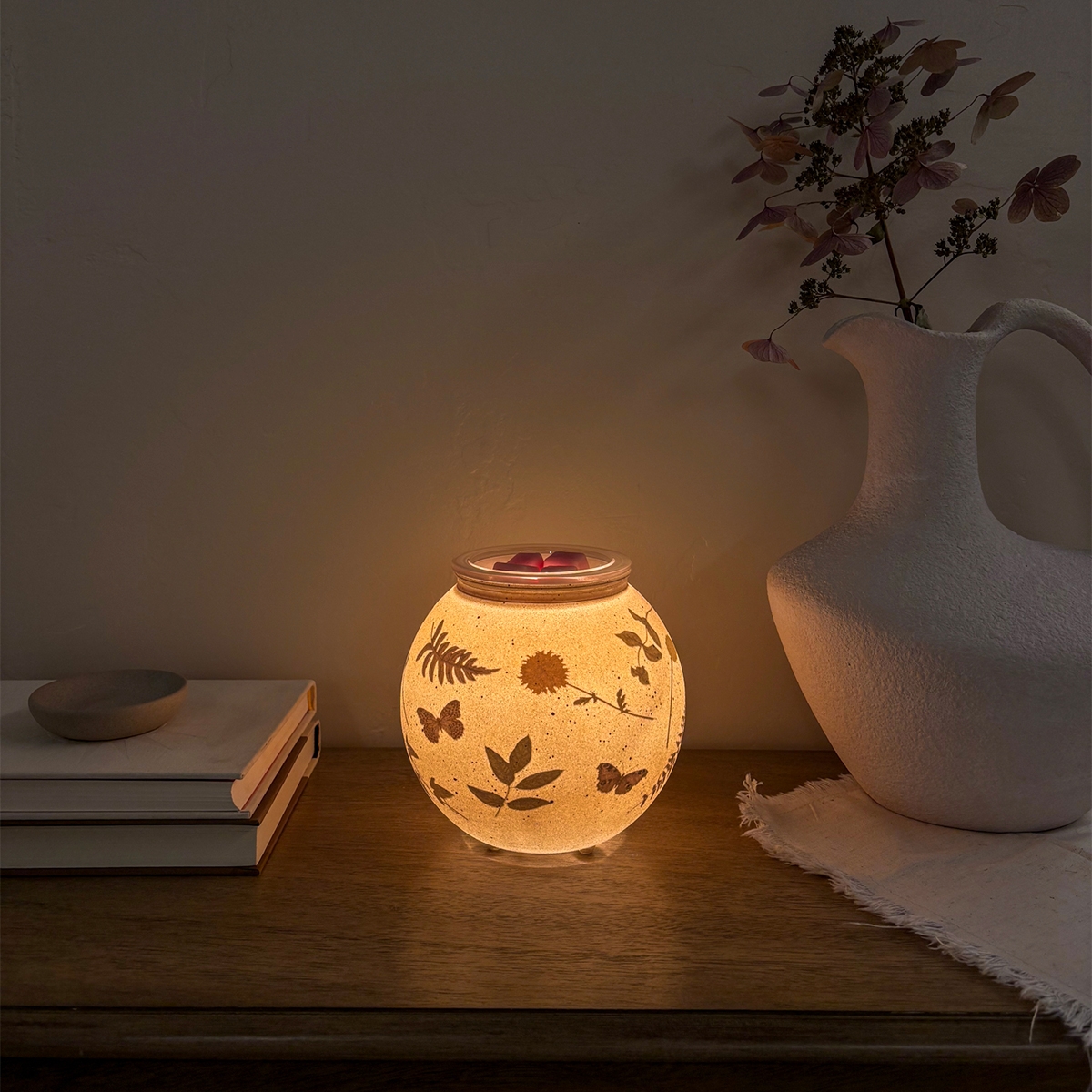 Leaves, florals and butterflies shine through sanded glass when illuminated – a soft hint of meadows in bloom.