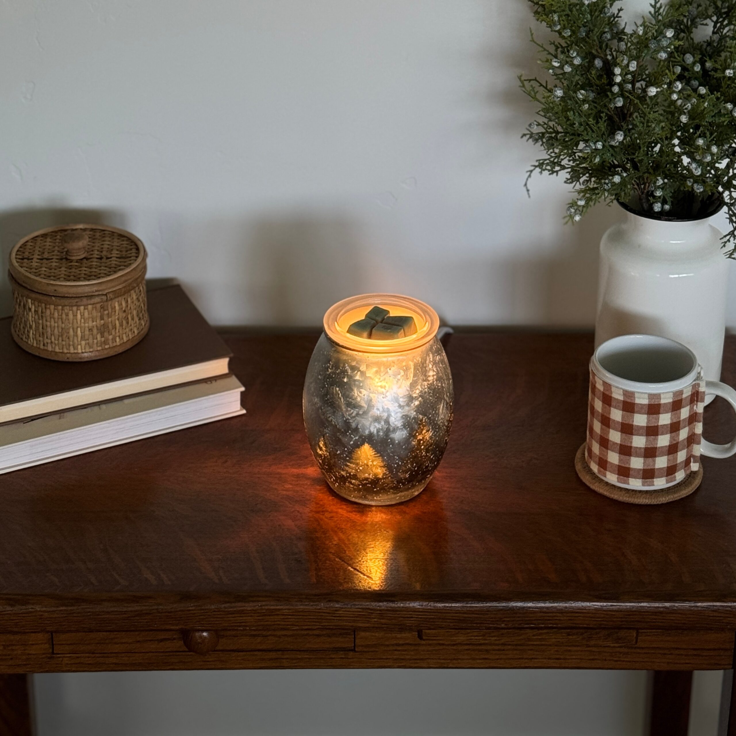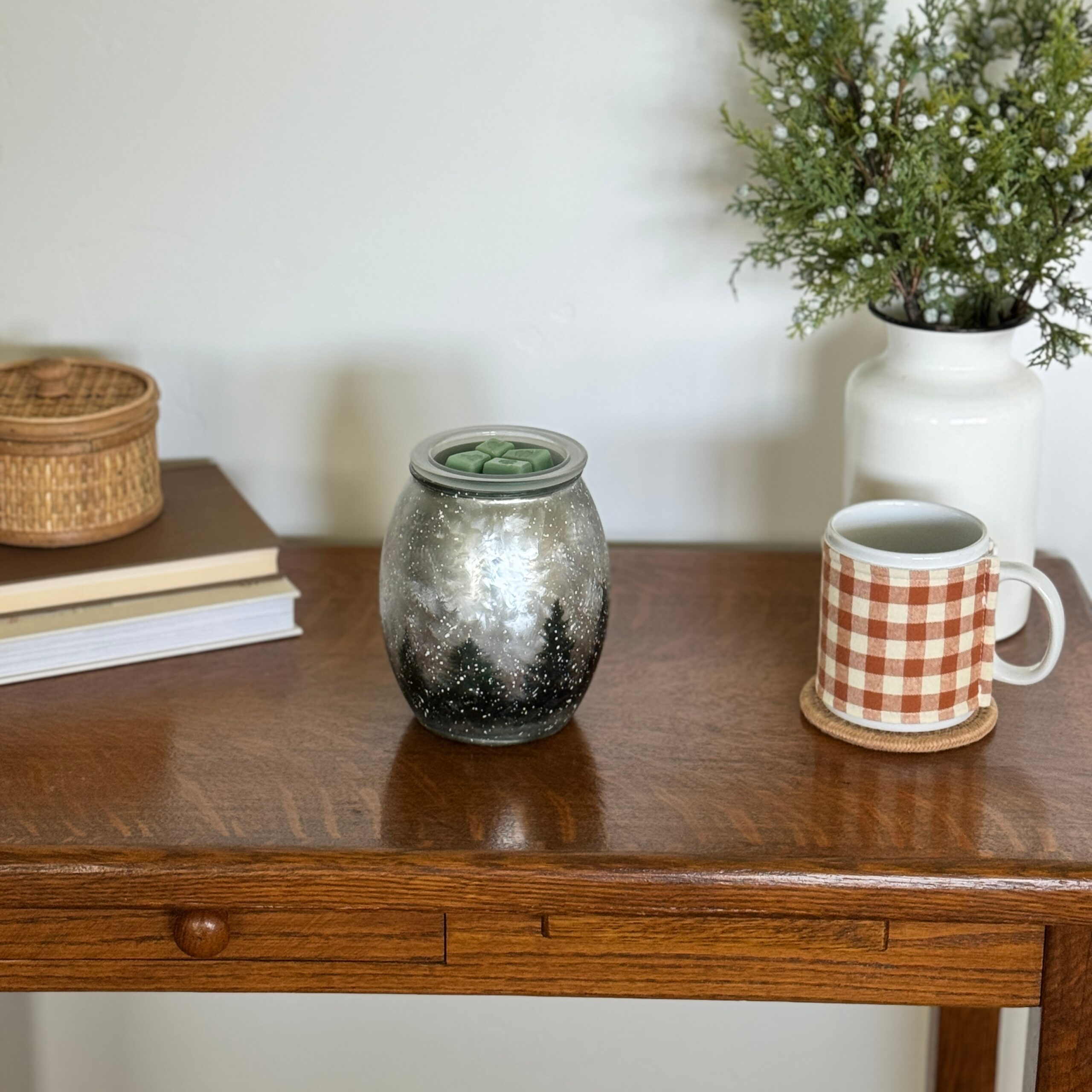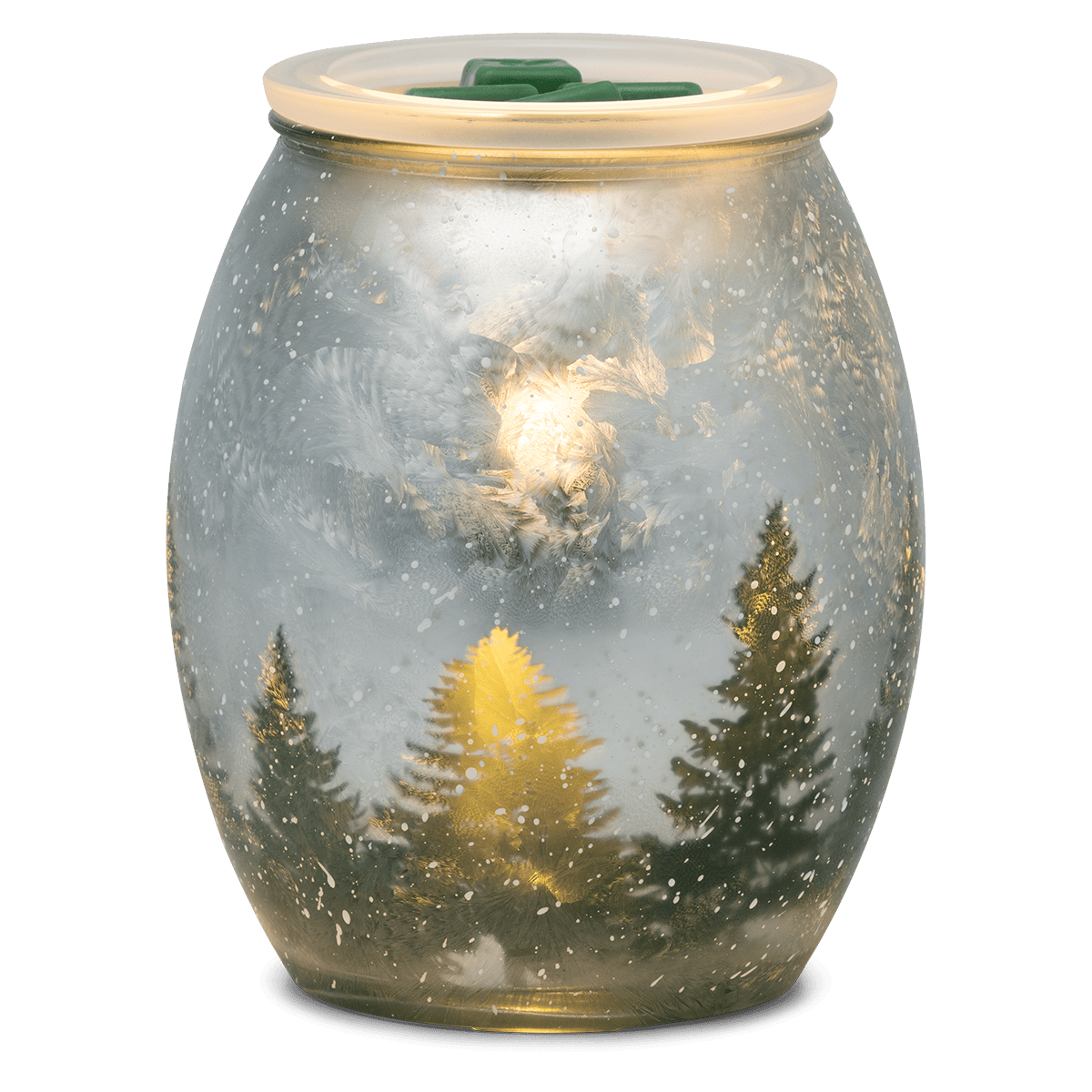 A hand-painted crystallized texture adds luminous dimension to this snowy forest scene.